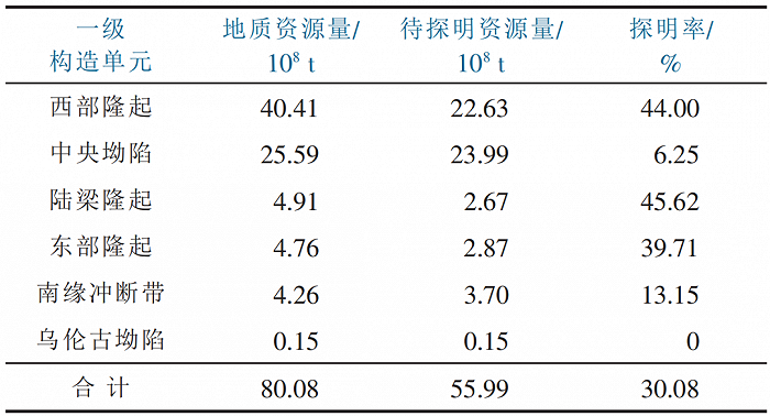 準(zhǔn)噶爾盆地一級(jí)構(gòu)造單元常規(guī)石油資源量分布統(tǒng)計(jì)(來自文獻(xiàn)《準(zhǔn)噶爾盆地石油地質(zhì)條件、資源潛力及勘探方向》)